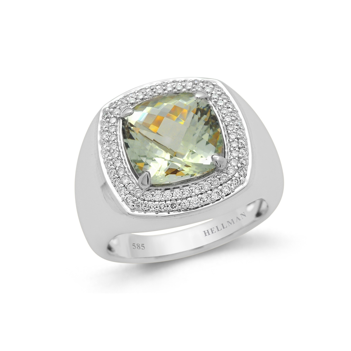 Et rå ring i hvittgull med en nydelig grønn ametyst omringer av vakre brillianter.