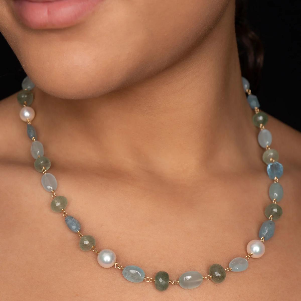Med en sammensetning av kjølig akvamarin, lysende Akoya-perler og sart grønn jordbærkvarts, danner Aqua Piccolo-halskjedet en balansert fargepalett langs halsens naturlige linje, som speiler havets stille dybde og rytme.