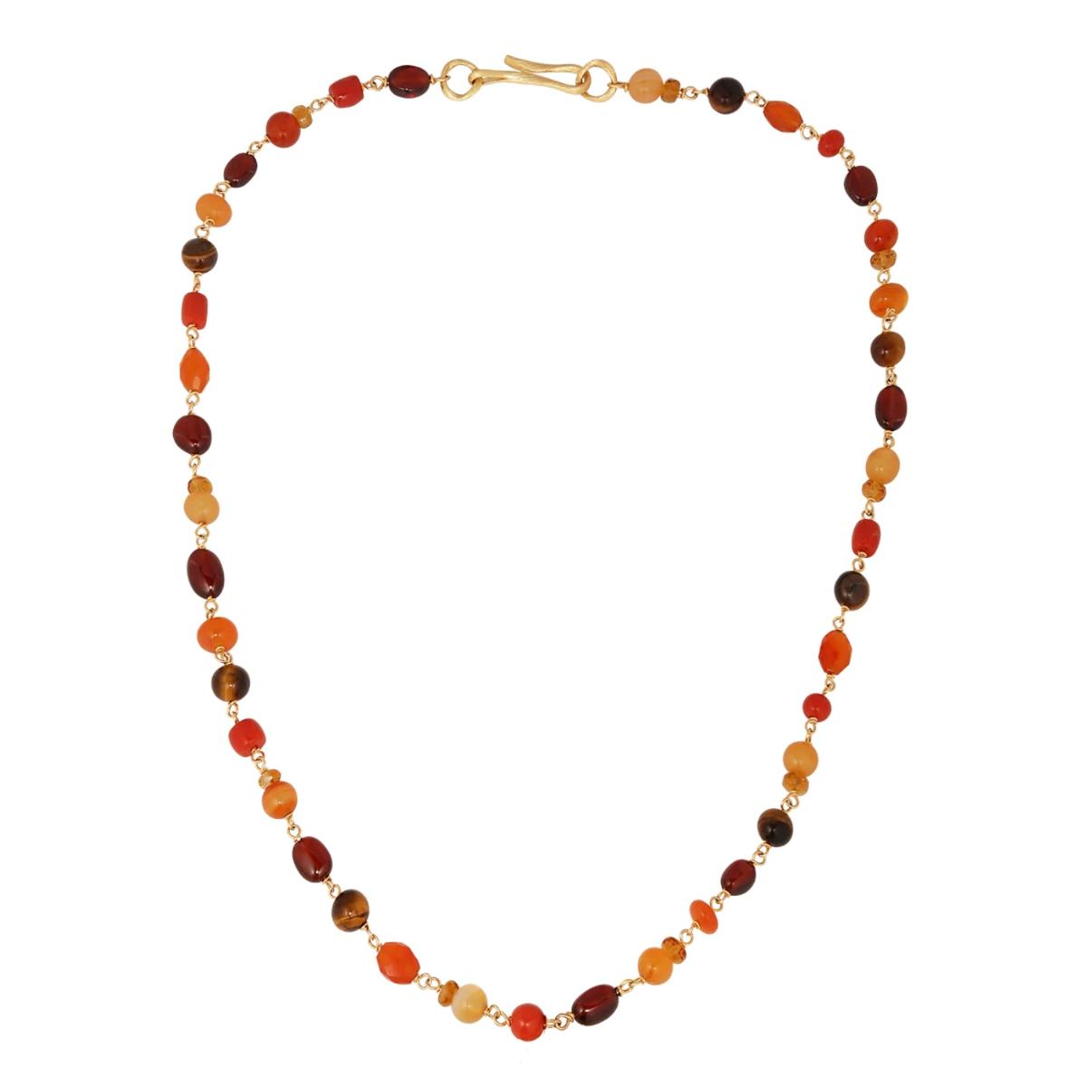 Solaris Piccolo-halskjedet er satt sammen av naturlige edelstener — korall, karneol, hessonitt-granat, tigerøye og cognackvarts — arrangert langs halsens naturlige linje i en strålende rekkefølge som vibrerer av varme og rolig energi.