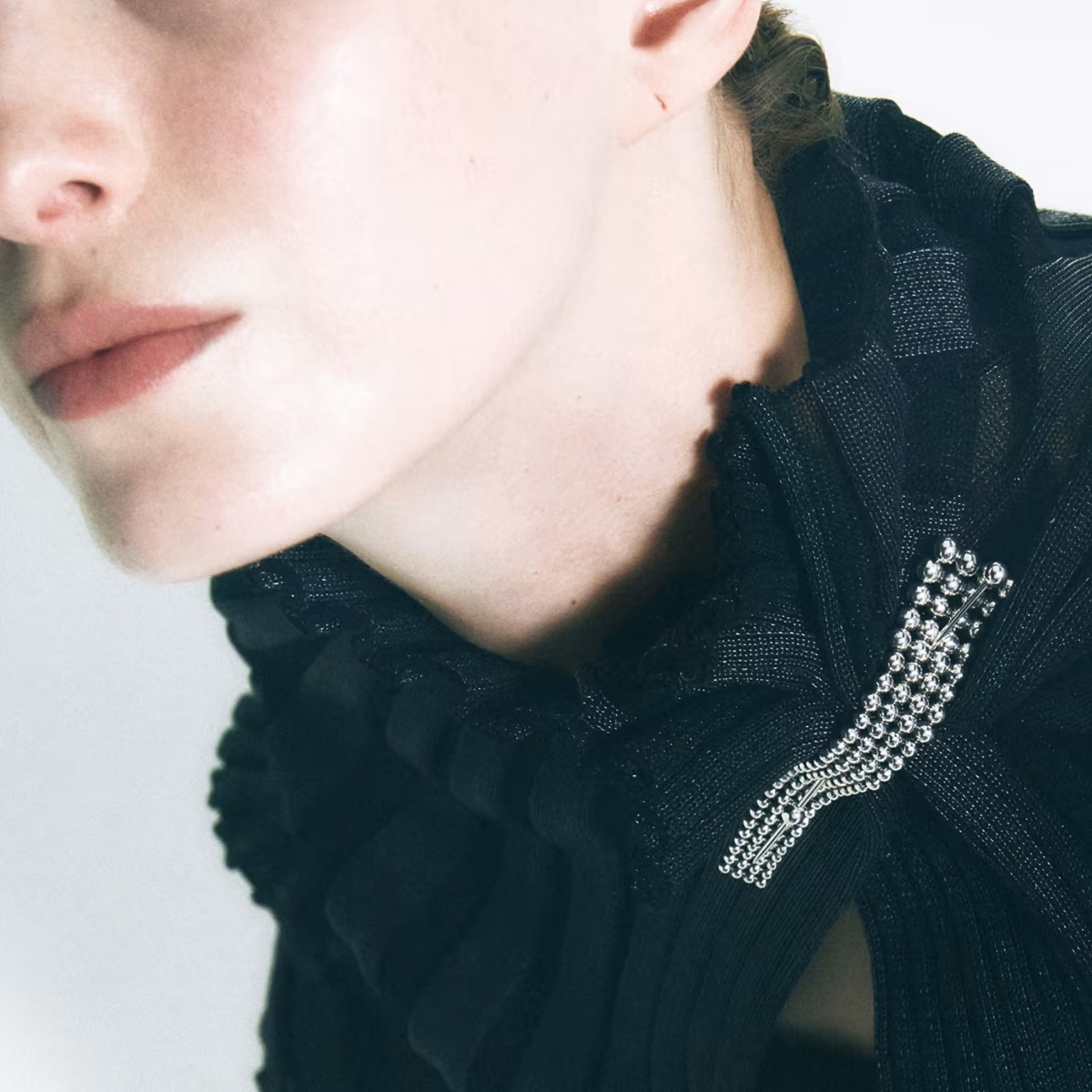 En vakker brosje med fire parallelle rader med farger i sterling sølv, som gradvis øker i størrelse. Den ene siden av smykket har en lett bueform. Brosjen er laget av resirkulert sterlingsølv og er en del av samarbeidet mellom Georg Jensen og det danske designmerket A. Roege Hove. Kolleksjonen har sitt utspring i møtet mellom disse to håndverkene: Georg Jensens overlegne ekspertise innen sølvhåndverk og A. Roege Hoves innovative tilnærming til strikkemote. Smykket har en innebygd nål som kan brukes til å feste søljen til alle typer klær.