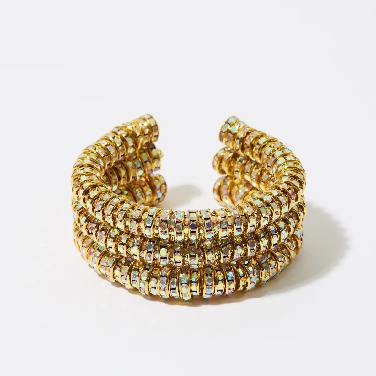 Pearl octopuss.y cleopatra zebra bangle er et chunky statement-armbånd laget i sølv- og gullbelagte Rondelle-perler. Perlene er tredd på en fleksibel wire for å gjøre armbåndet justerbart til forskjellige håndleddstørrelser. Den åpne lukkingen gjør armringen avslappet og allsidig.