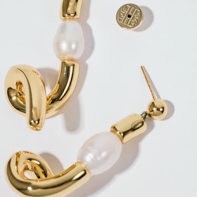 Disse asymmetriske statement-øredobbene er en oppdatert vri på våre signaturslanger, og har en høyglansende metallisk finish med et ferskvannsperle-aksent.