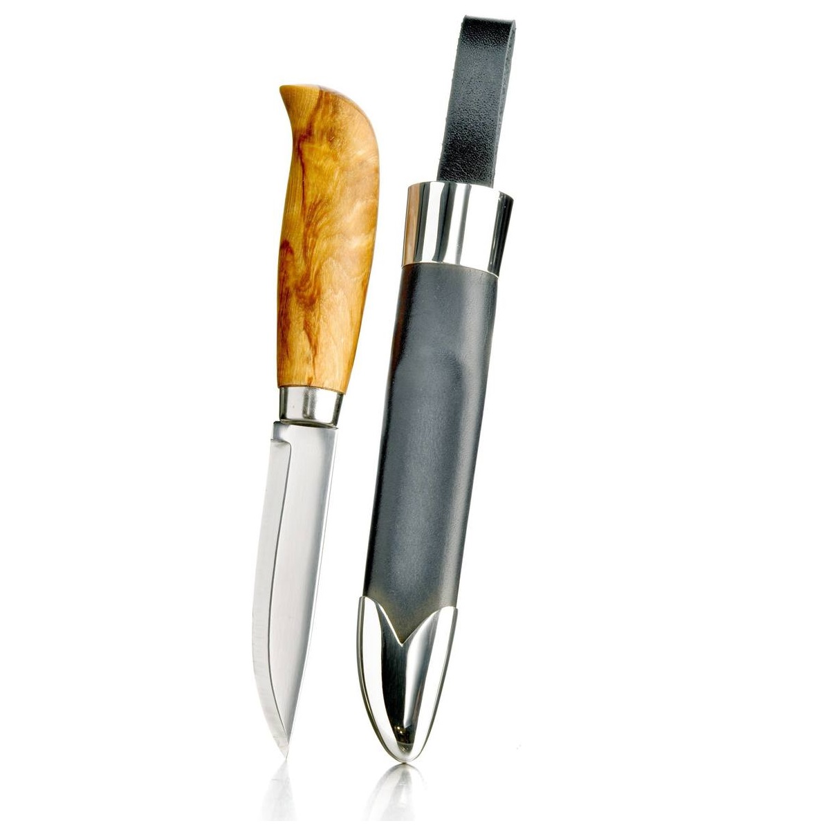 Kvalitetskniv med sølvdetaljer, sort skinn som kan graveres.