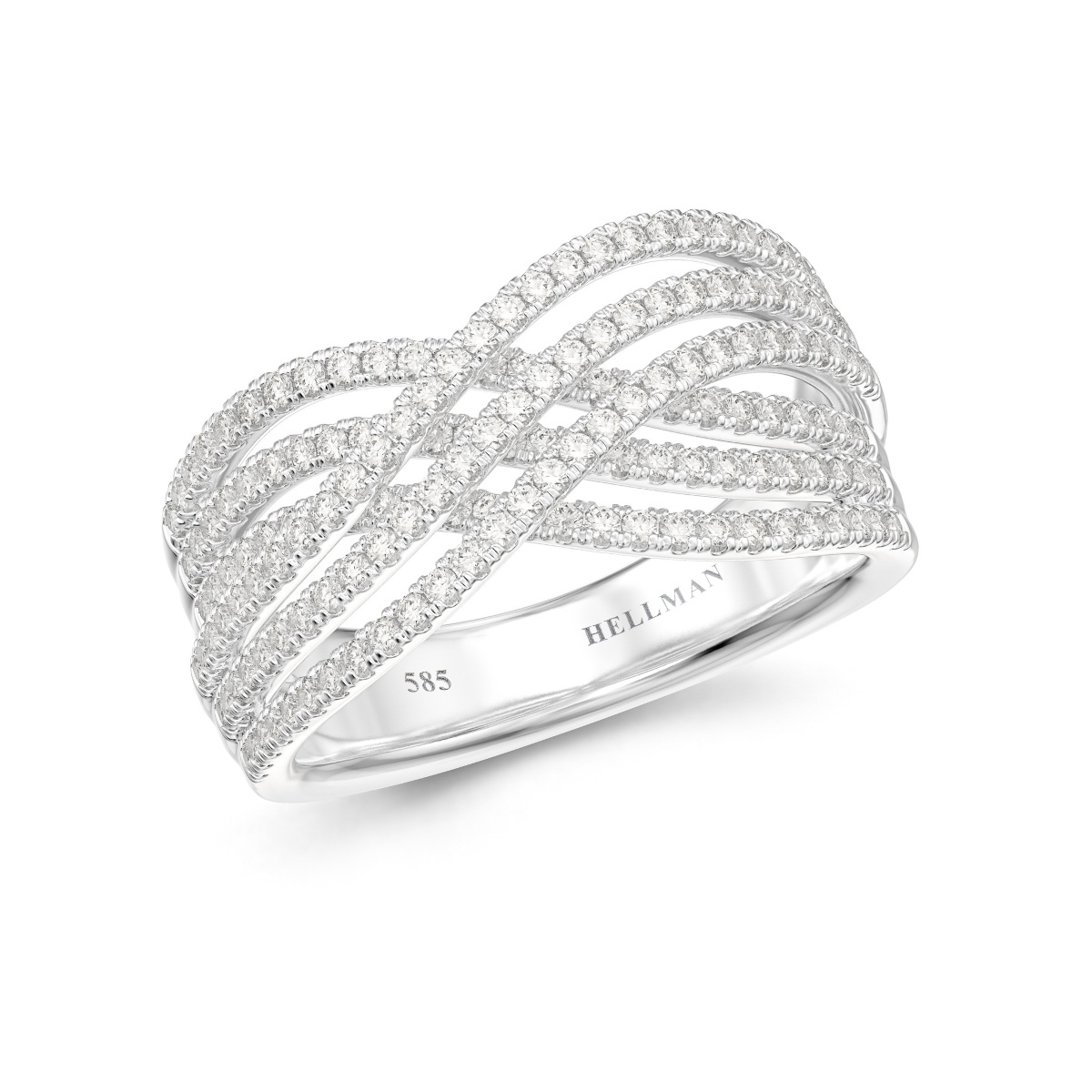 En spektakulær og sofistikert ring i hvitt gull, designet med flere elegante, flettede linjer som gir et levende og dynamisk uttrykk. Ringen er besatt med hele 159 briljantslipte diamanter med en totalvekt på 0,78 ct (TW.SI), som skaper et intenst og luksuriøst spill av lys fra alle vinkler.