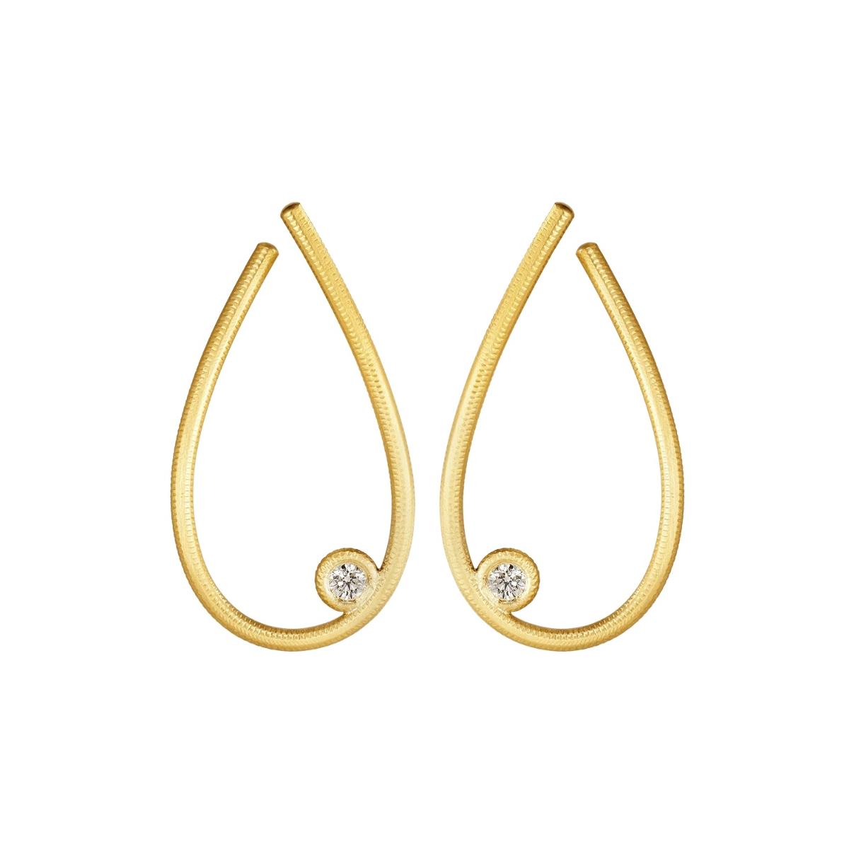 Hver ørering er laget i 18 karat gull og prydet med en briljantslipt diamant på 0,18 ct, elegant skjult på innsiden av buen. Plasseringen gir en følelse av at diamanten svever fritt, og selv når øredobben hviler stille, skapes en illusjon av bevegelse som trekker blikket til seg.