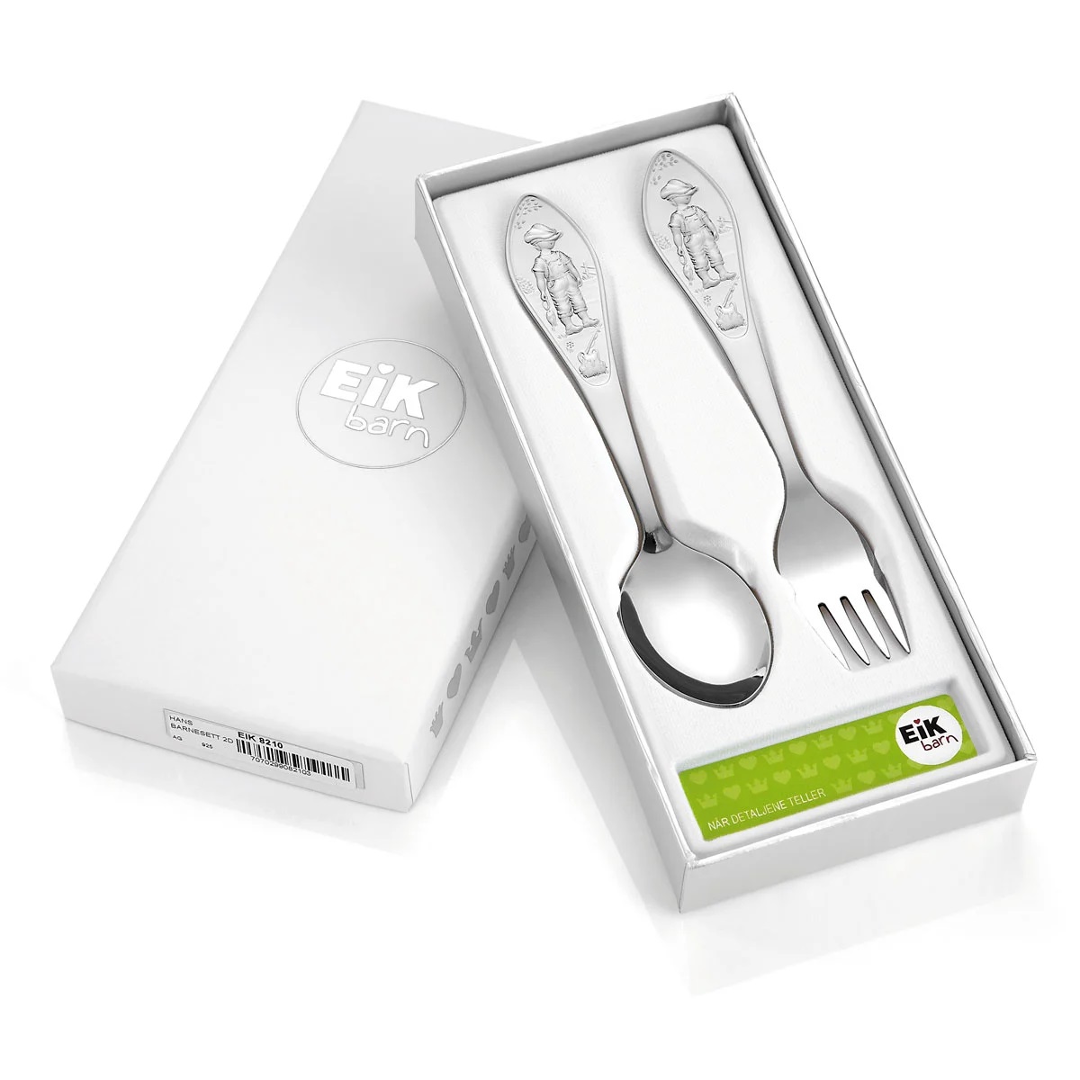 Settet er en del av serien Hans fra eventyret om Hans og Grete. I denne serien finnes også barnekniv, babyskje, sølvkrus, samleskrin, dåpsramme, lommekniv og porselensservise. Bestikket er produsert i sølv (925s), i EIKs lokaler i Tønsberg. Leveres i fin gaveeske.