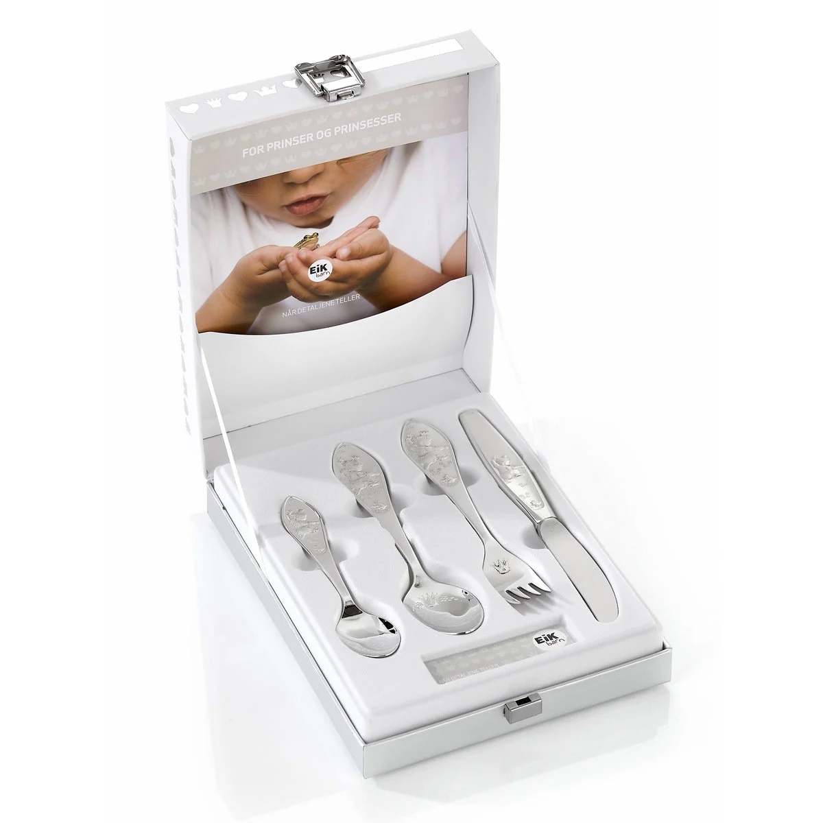Settet er en del av serien For prinsesser. I denne serien finnes også sølvkrus og sølvskål, porselensservise, smykkeskrin, fotorammer og album. Bestikket er produsert i sølv (925s), i EIKs lokaler i Tønsberg. Leveres i fin gaveeske.
