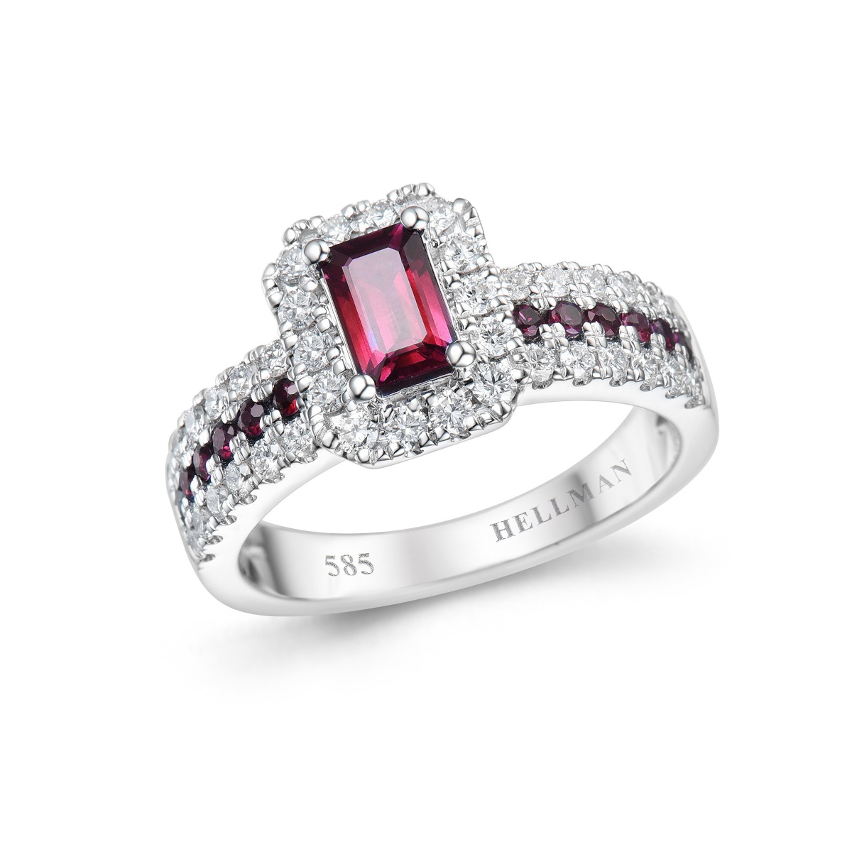 Denne ringen i 585 hvitt gull kombinerer klassisk eleganse med et moderne uttrykk. Midtpunktet er en vakkert octagon-slipt rubin, omkranset av 42 brillantslipte diamanter som gir ringen et sofistikert og glitrende preg.