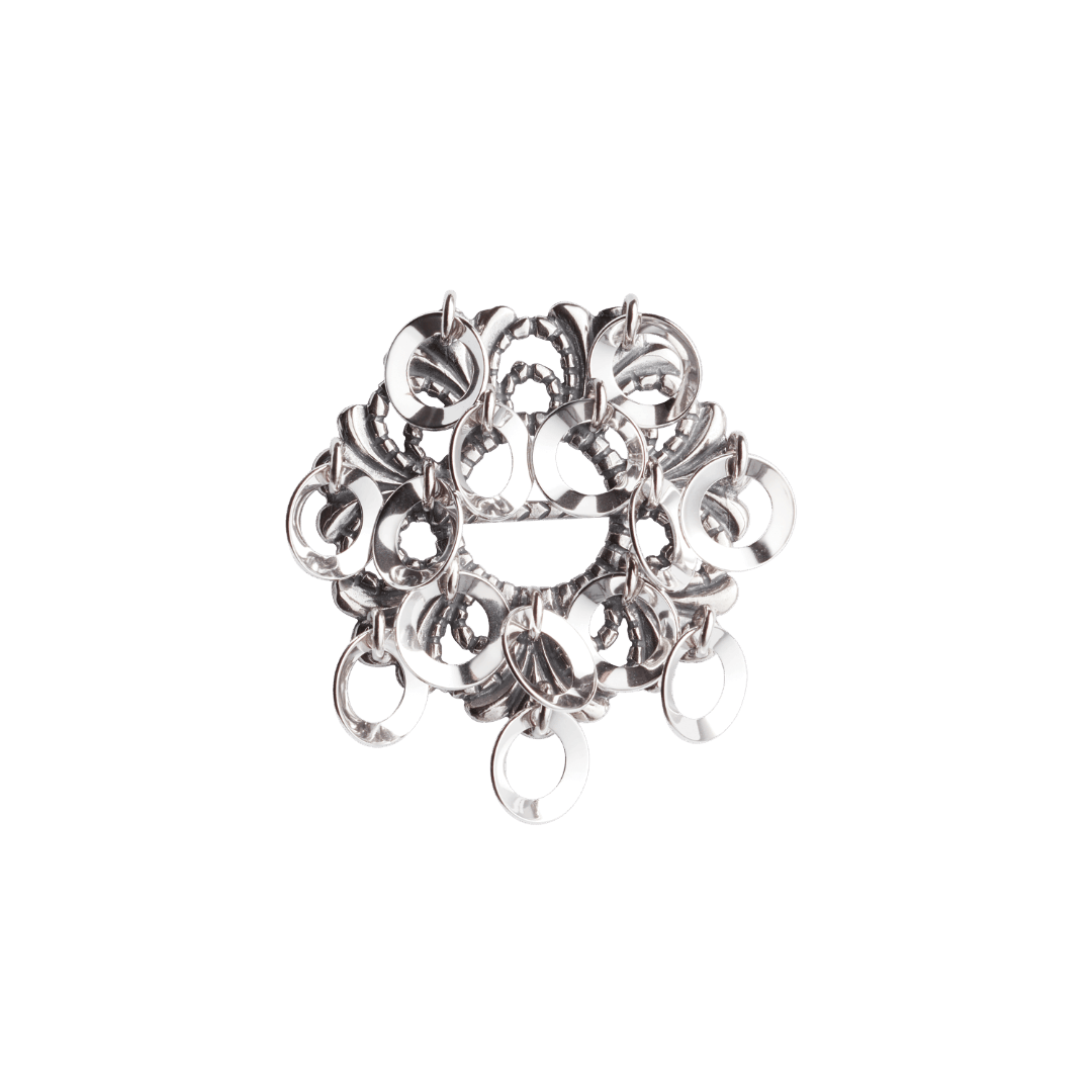 En liten, støpt sølje i oksidert sølv til bunader i Trøndelag. Den er rikt dekorert med raslende ringløv, og samspillet mellom blanke og mørke partier skaper vakre kontraster. Finnes også i en større utgave.